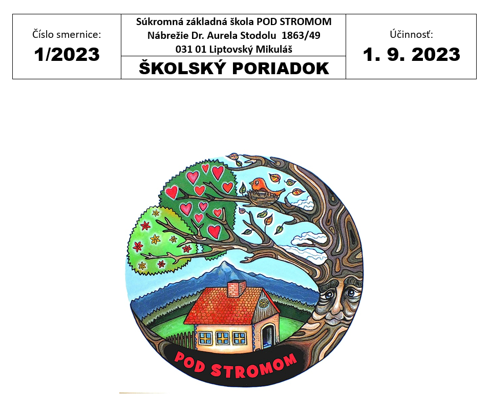 - Školský poriadok Súkromnej základnej školy POD STROMOM Liptovský Mikuláš sa vydáva v zmysle § 153 zákona č. 245/2008 Z. z. o výchove a vzdelávaní (školský zákon) a o zmene a doplnení niektorých zákonov v znení neskorších predpisov (ďalej len "školský zákon").